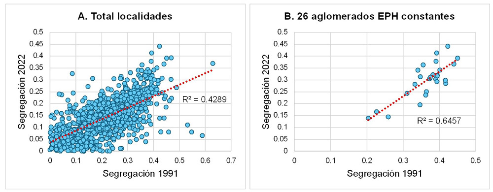 Un aspecto interesante a destacar es que a nivel de localidades existe una alta correlación entre los valores de SRS en cada año censal y el inmediatamente anterior y/o posterior (Tabla 3). Incluso, la correlación también es fuerte entre los años extremos de la serie 1991 y 2022 (r=0,654 para el universo de 940 localidades, y r=0,804 para los 26 aglomerados constantes de la EPH). Esto significa que, más allá de una tendencia a la baja, no se han producido cambios radicales en el patrón de segregación al interior de la mayoría de las localidades. La Figura 2 muestra cómo se distribuyen los niveles de SRS en 1991 y 2022, con algunas localidades que sí aparecen como casos atípicos (muy bajos niveles de SRS en 1991, y muy altos en 2022, o viceversa).