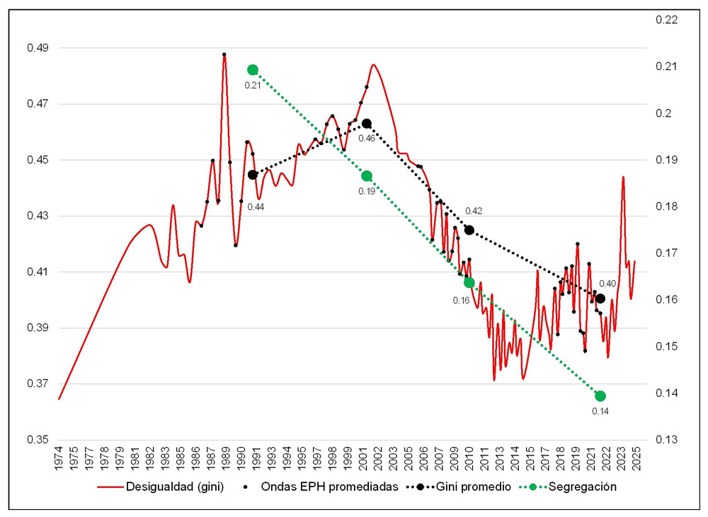La desigualdad tuvo una suba notable de 1974 a 1982, años que mayormente corresponden a la dictadura militar que gobernó entre 1976 y 1983. Sin embargo, recién alcanzaría su pico histórico algunos años más tarde, ya en democracia, durante la crisis hiperinflacionaria de fines de los ochenta. Luego de una fuerte baja a comienzos de la Convertibilidad, inicia un nuevo ciclo ascendente que otra vez alcanza su pico durante una crisis (2001-2002). Posteriormente, con los sucesivos gobiernos de Néstor Kirchner y Cristina Fernández de Kirchner, la desigualdad se retrae de manera sostenida durante los 2000 hasta casi retomar, entre 2012 y 2015, su piso histórico de 1974. A partir de 2015, la desigualdad inicia, primero, un nuevo ciclo ascendente con el gobierno de Mauricio Macri, y luego, fluctuaciones levemente a la baja durante la presidencia de Alberto Fernández, en cuyo anteúltimo año de gobierno se realiza el censo de 2022. El último tramo de la serie 2023-2025 muestra un nuevo repunte en la desigualdad, aunque esta etapa excede ya nuestro análisis de la SRS.