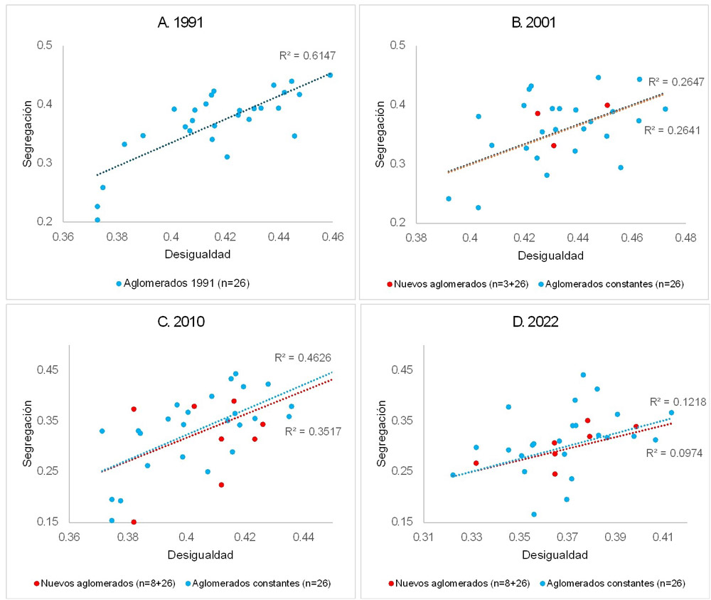 Figura 4. Gráficos de dispersión, correlación entre desigualdad y segregación. Aglomerados EPH, 1991-2022