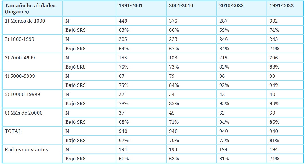 Los resultados con la evolución de la SRS se presentan para el total del país y desagregados por tamaño de las localidades en seis categorías según la cantidad de hogares (o una aproximación a la cantidad de viviendas ocupadas, descontando aquellas donde residen dos o más hogares): menos de 1.000, 1.000 a 1.999, 2.000 a 4.999, 5.000 a 9.999, 10.000 a 19.999, y más de 20.000 hogares. Para una idea aproximada de la equivalencia de este tamaño en términos de población, puede el lector considerar que el promedio de personas por hogar en viviendas particulares fue de 3.7 en 1991, 3.6 en 2001, 3.3 en 2010 y 2.9 en 2022.