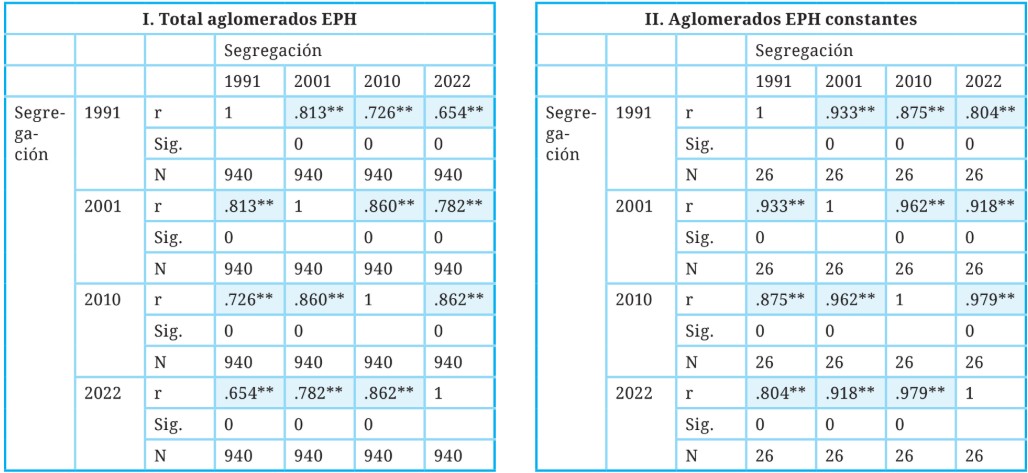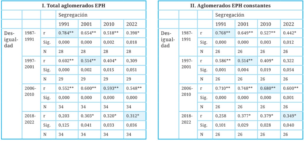 Tabla 4. Correlación entre segregación y desigualdad de ingresos en aglomerados EPH, 1991-2022